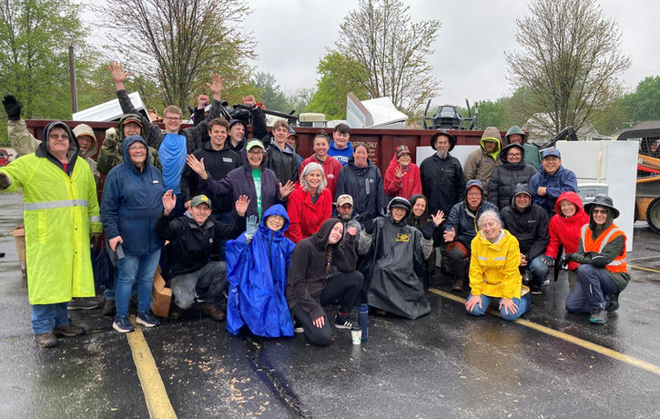 Sorting and de-capping volunteers show off 12 bags of de-capped plastic water bottles, two bags of aluminum cans, and 10 gallons of...